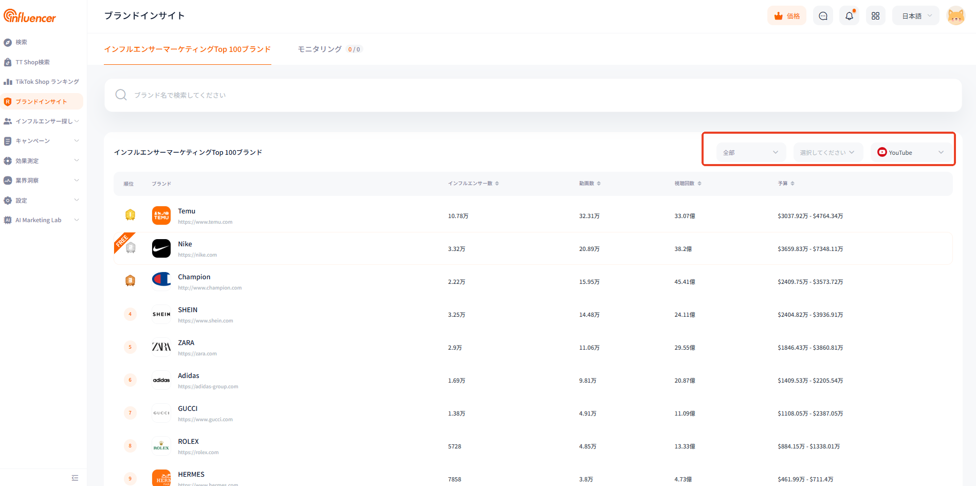 ノックスインフルエンサーのブランドインサイト機能は、グローバル市場で活躍するトップ100ブランドのインフルエンサーマーケティングデータを分析し、業界トレンドの把握から効果的なキャンペーン策定まで、インフルエンサーマーケティングの成功を支援する。3つのソーシャルメディアプラットフォームを対応し、17の主要業界別フィルタリングと地域ターゲティング機能も完備している。