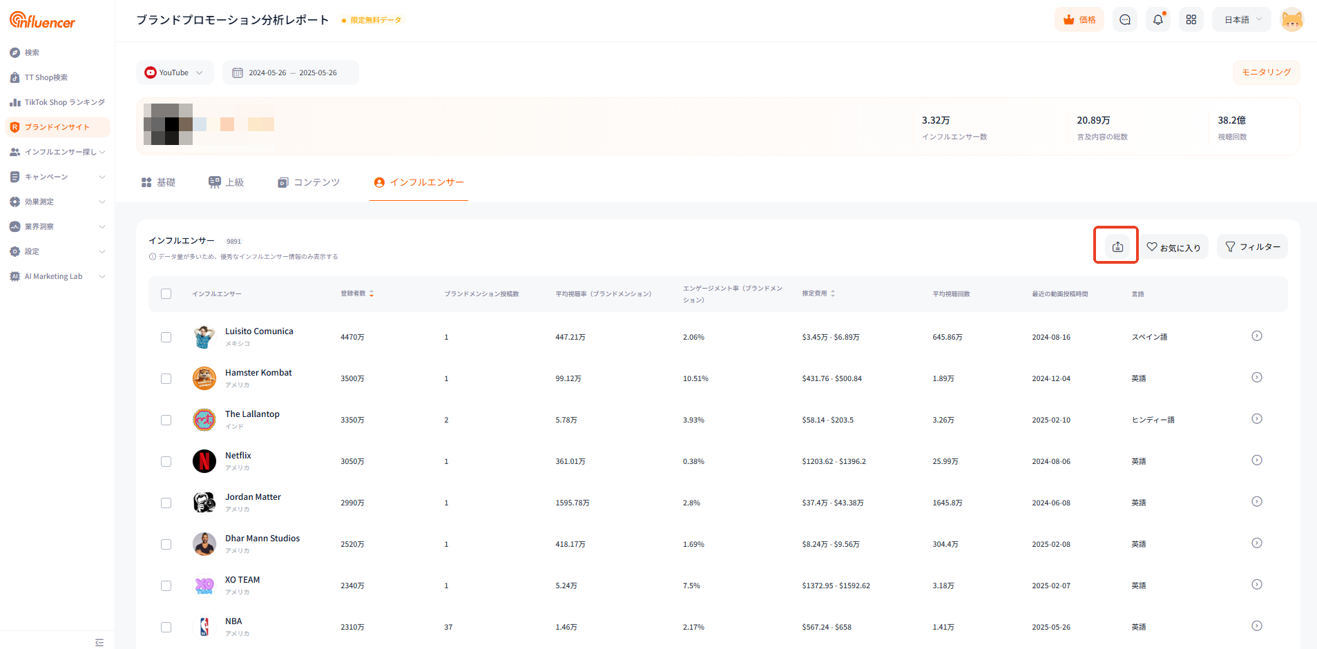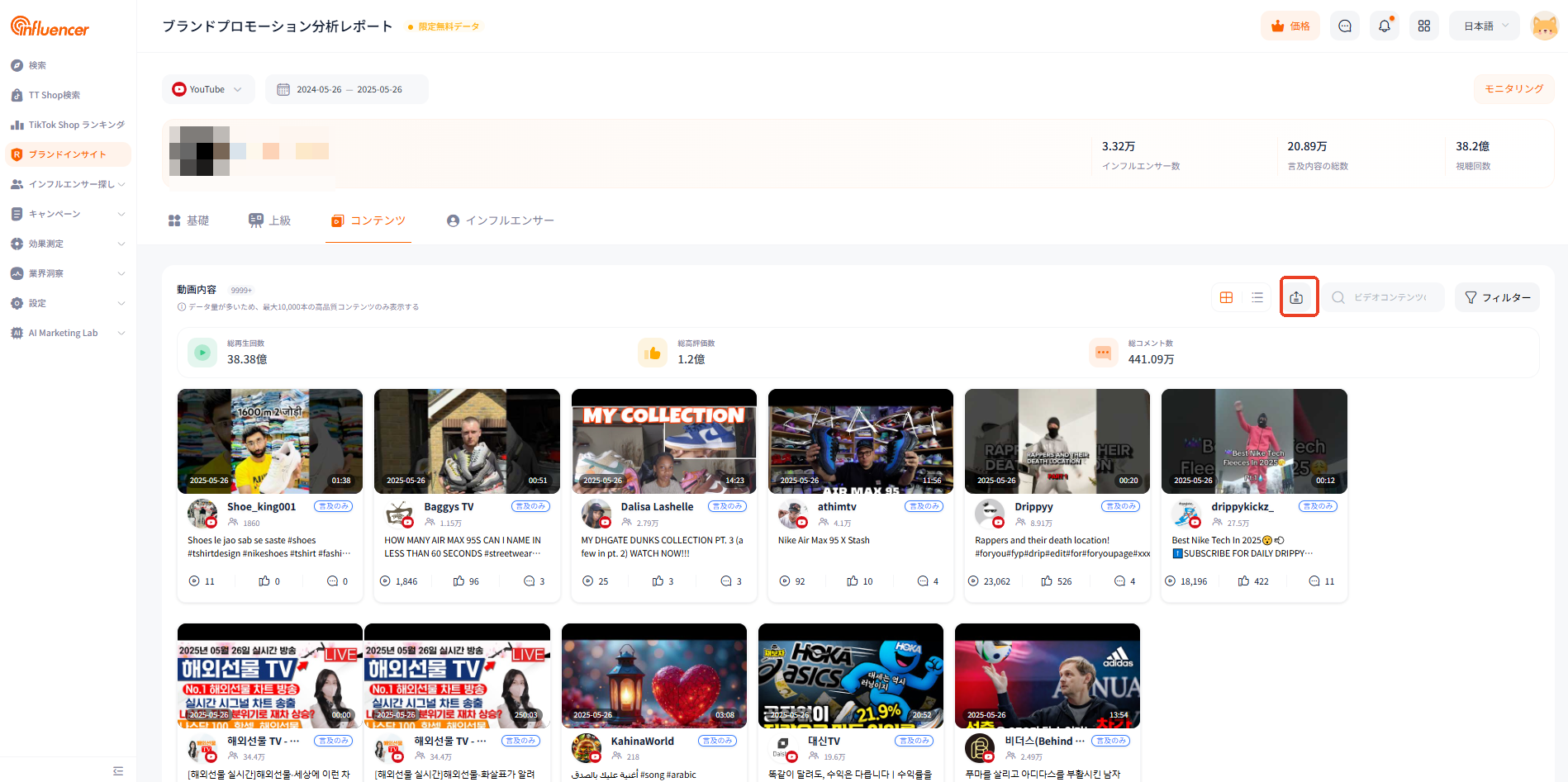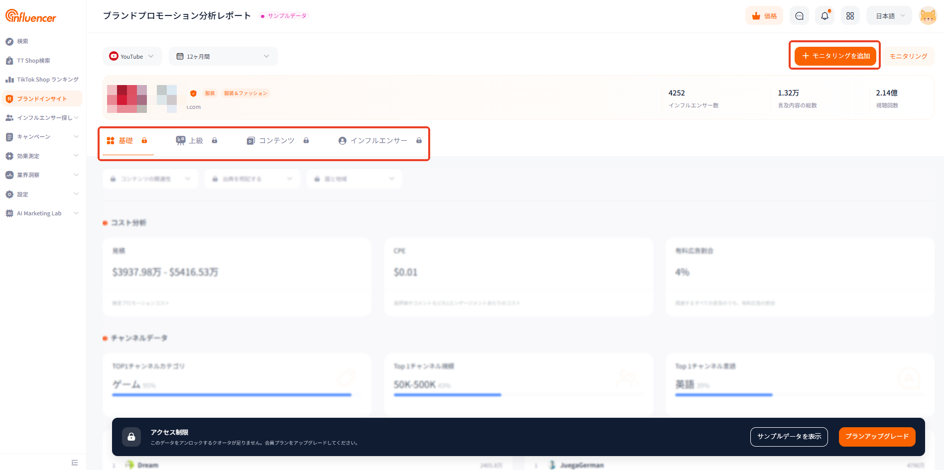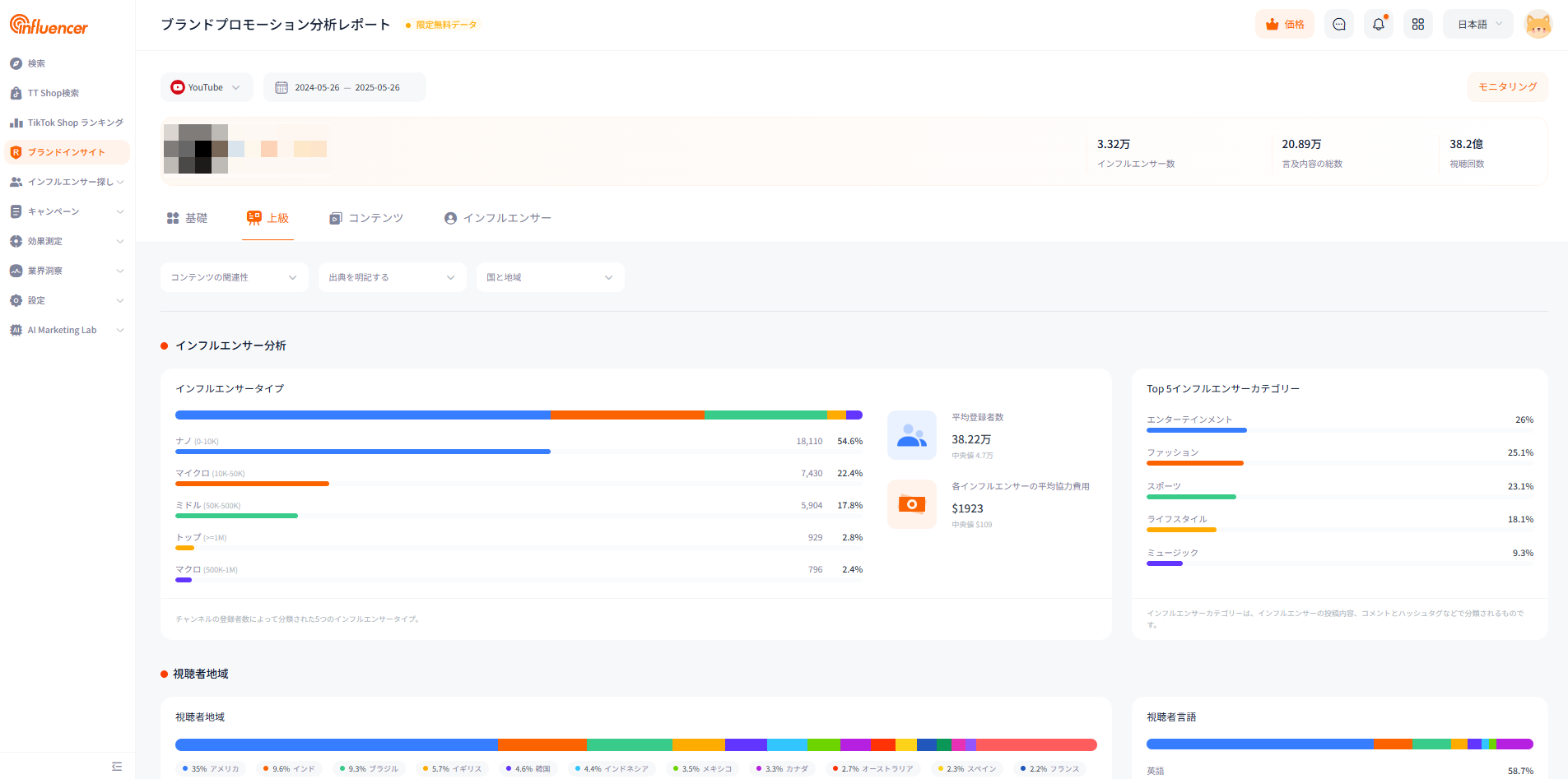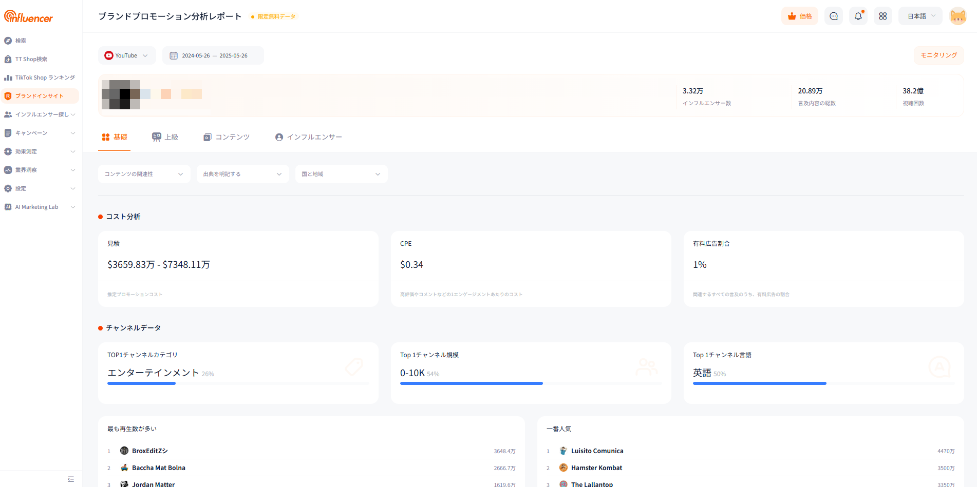 任意のブランドをクリックすると、分析ページに遷移する。必要に応じて各種レポートのロックを解除できる。解除後、オーディエンス分析、エンゲージメント分析、プロモーション動向、インフルエンサー属性、広告動画投稿分析などのデータを確認でき、該ブランドのマーケティングを把握するに役立つ。